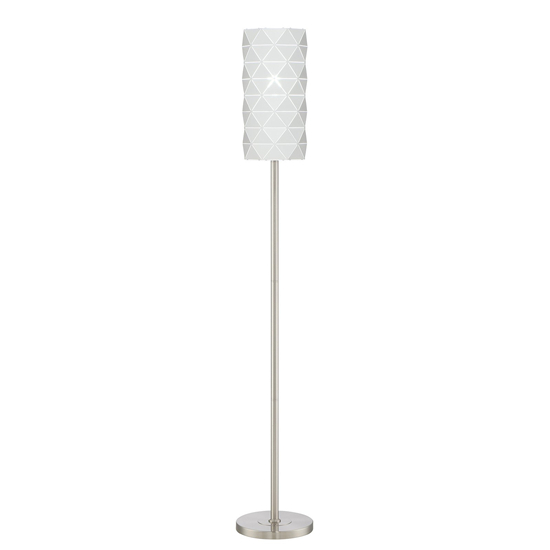 Smooth and contemporary floor lamp with round, polished steel base and candlestick font. Cylindrical shade is pure white with cutwork triangle designs.
