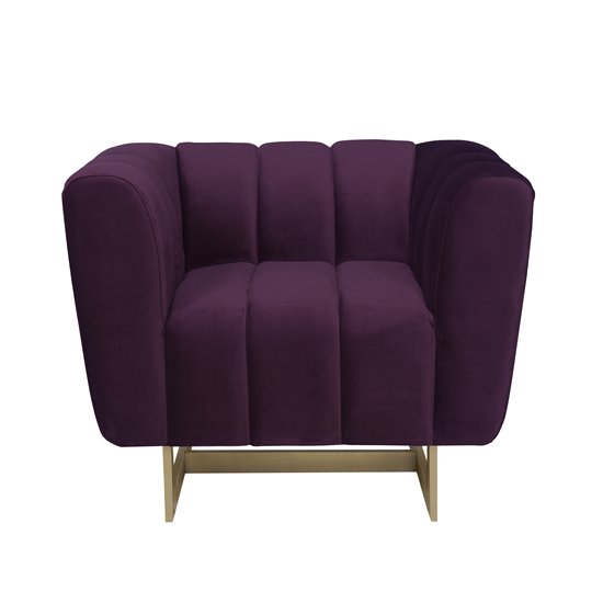 Elegant plum velvet chair with contemporary tuxedo arms and channel effect on back and seat features gold-look brushed brass metal base.