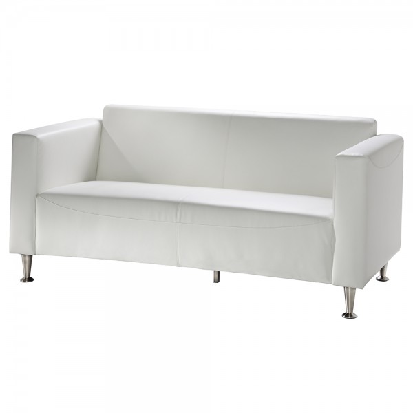 White vinyl loveseat with sleek brushed metal legs. Clean and modern look provides style and comfort.