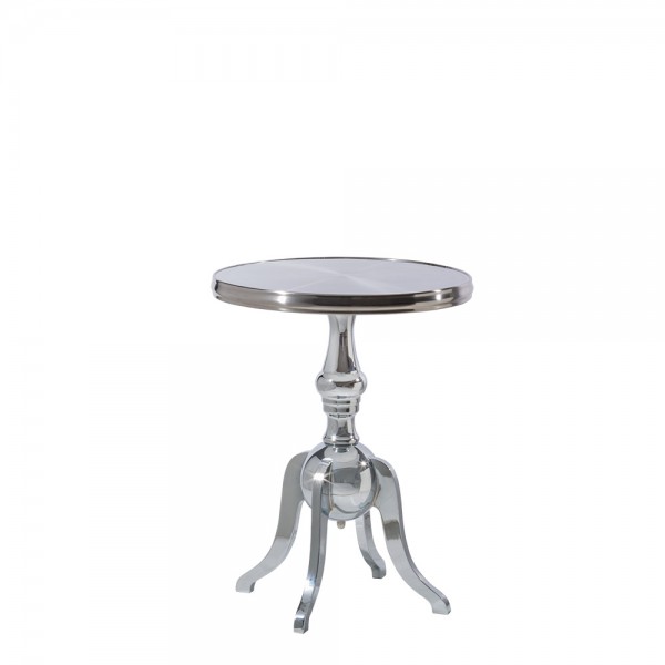 Silver metal occasional table with decorative pedestal base in the Hollywood Regency style coordinates perfectly with modern or traditional soft seating.