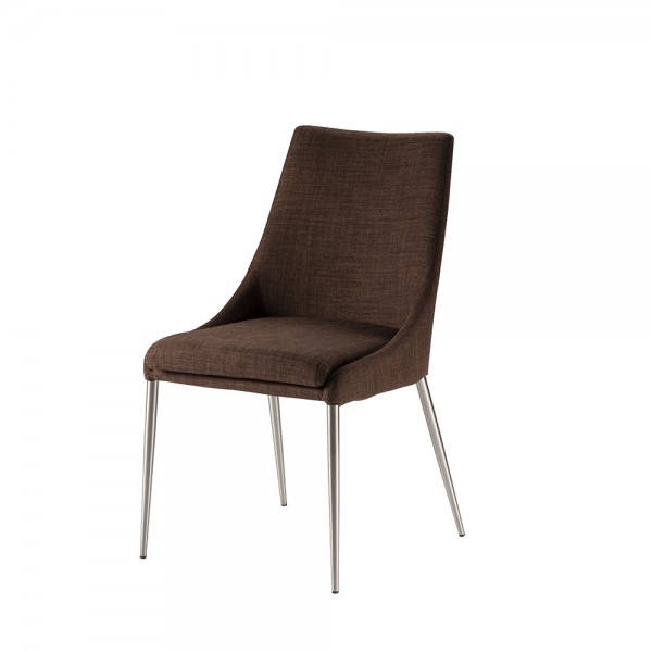 Midcentury brown fabric chair with brushed metal legs compliments modern or rustic café and communal tables.