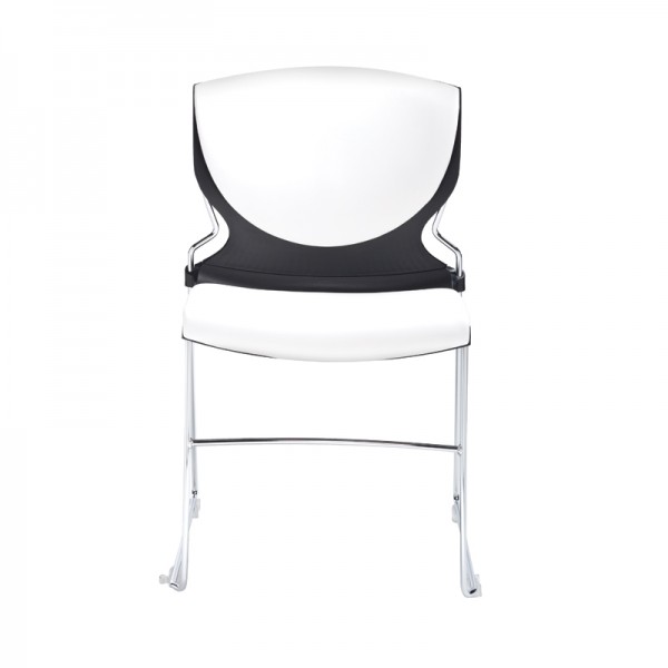 Euro style stacking chair with white padded seat and back with chrome legs.