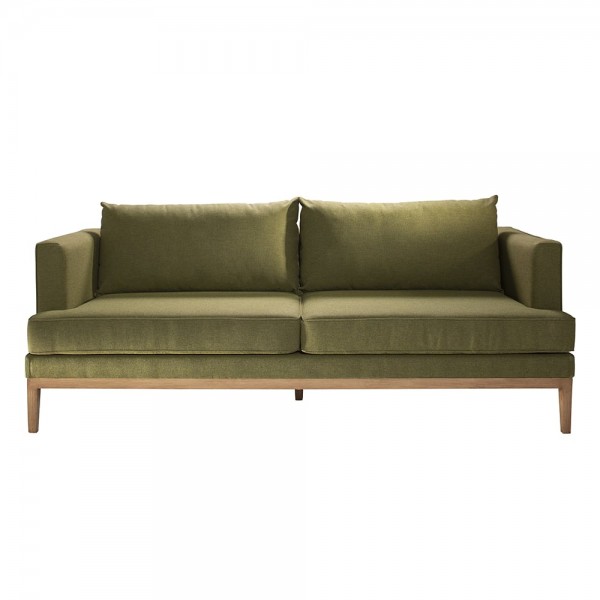 Casual, sage-green sofa with beech “wood look” frame features sunbrella fabric for both indoor and outdoor events