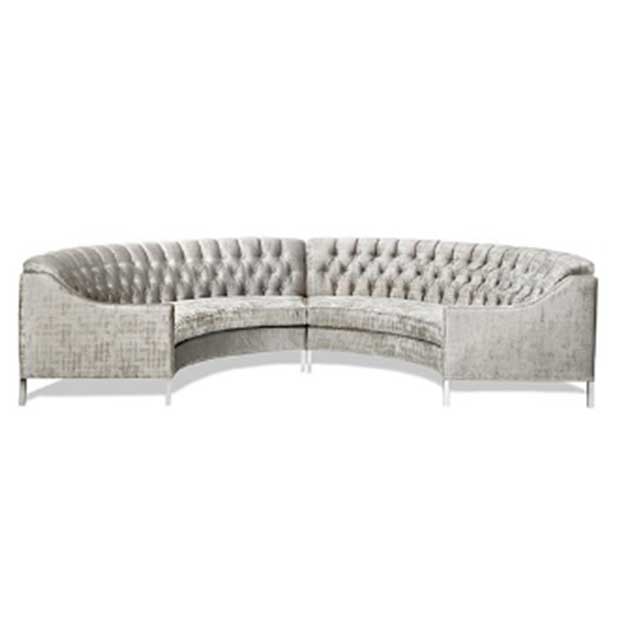 Luxurious textured silver velvet 2-piece sectional features button tufted back, winged track arm, elegant nail head trim, and crisp stainless steel legs.