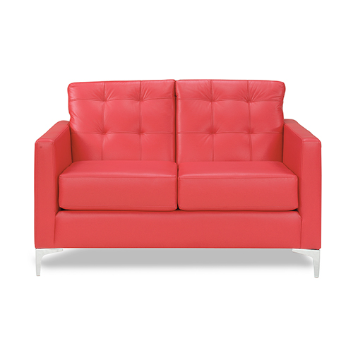 Red vinyl loveseat with modern streamlined appearance and classic architectural lines.