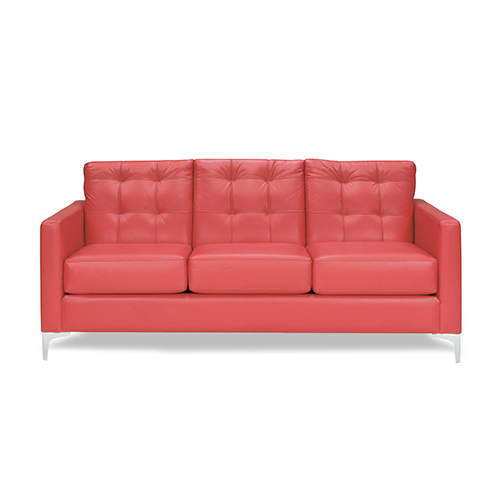 Red vinyl sofa with modern streamlined appearance and classic architectural lines.