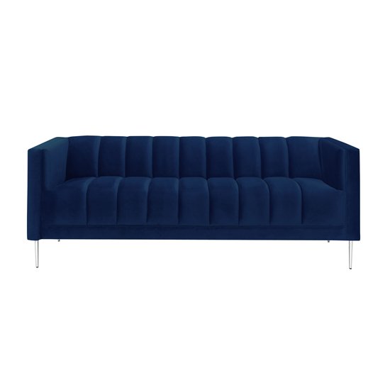 Plush royal blue velvet sofa with contemporary tuxedo arms and channel effect on back and seat features brushed chrome legs.