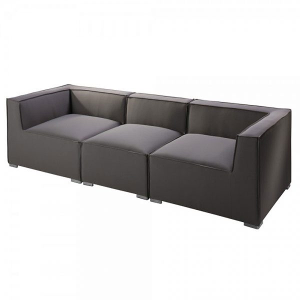 Modular 3 piece sofa in warm gray indoor/outdoor fabric with flanged stitching and comfortable deep seats for casual lounge environments.