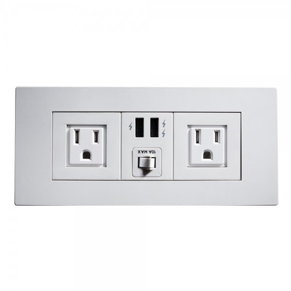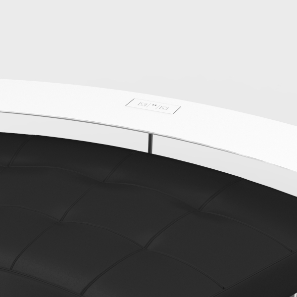 The large modular vinyl serpentine with chrome legs and 6 white laminate powered tables is perfect for charging stations for lounges, parties and cyber cafes.  Each powered table includes one white centered power hub with two outlets and two USB ports.