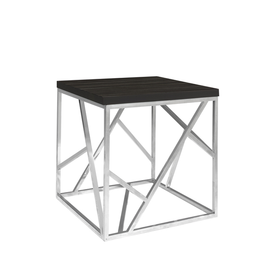 Thick African Zebrawood table top adds contrast to the intriguing geometric shapes of this end table’s stunning chrome base.
