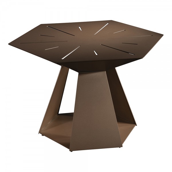 Geometric, metal cocktail table in sienna brown finish with a small footprint for intimate spaces.