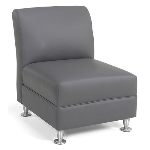 In charcoal grey. Geometrically-shaped pieces add visual interest to the Grammercy Collection. Thin charcoal grey leather set offers modular seating options that provide understated elegance.