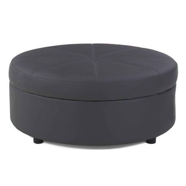 Sleek contemporary style round ottoman in gunmetal grey vinyl with clean lines.
