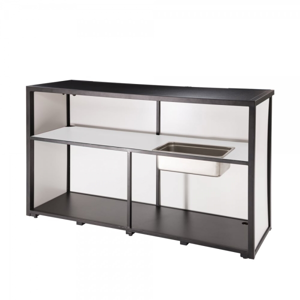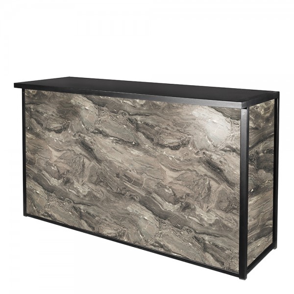 Classic black framed bar with gray marble laminate front and sides. The Maxim Bar is available as a dry bar with a shelf or a wet bar with an ice bucket and cutting board.