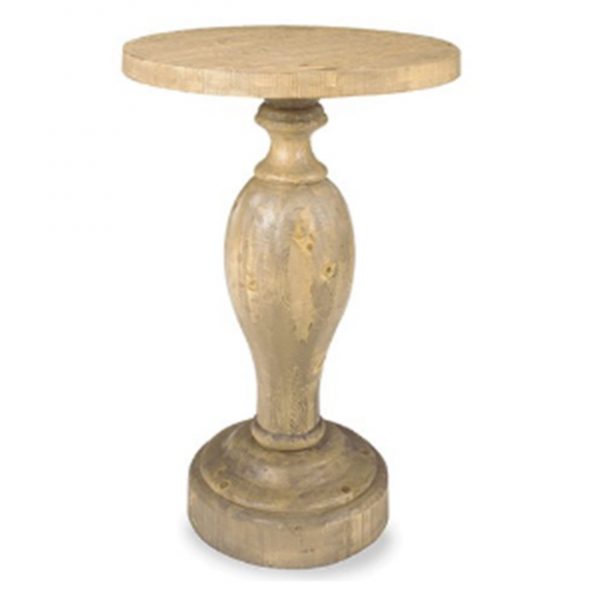 Bar table with versatile design features natural reclaimed pine finish and pedestal base.