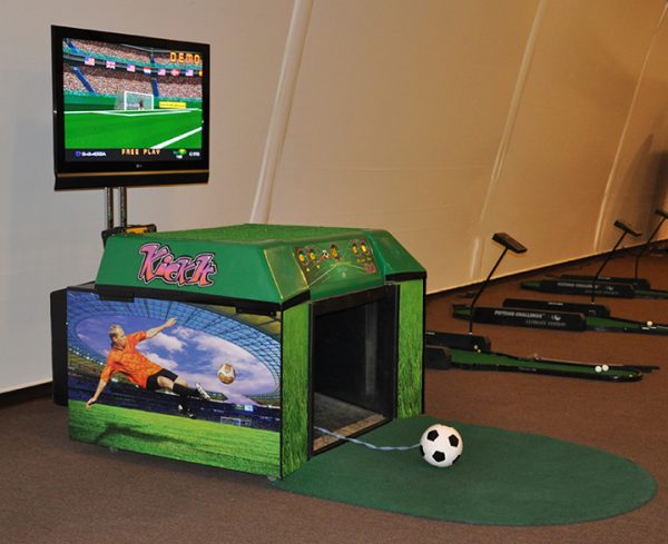 Kick It Soccer Deluxe is a soccer game that uses a real soccer ball attached to the game! Can you score on this life like simulator? The screen shows the goal and you have to kick the ball by him to score the goal. It’s a 2-player and each player gets ten shots to make it. This game works great for team building events.