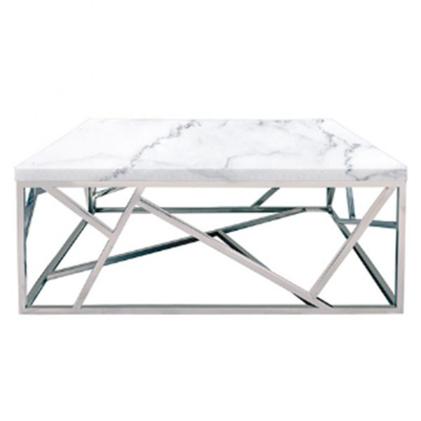 Chrome bars create an intriguing angled base on this thick marble top cocktail table with a modern feel.
