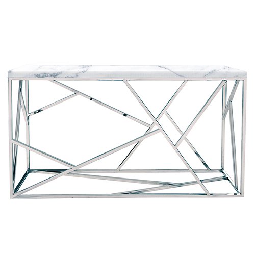 Chrome bars create an intriguing angled base on this thick marble top console table with a modern feel.
