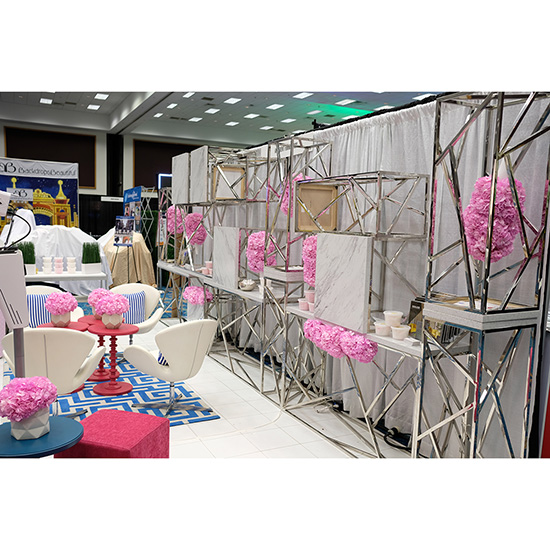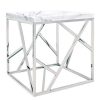 Chrome bars create an intriguing angled base on this thick marble top end table with a modern feel.