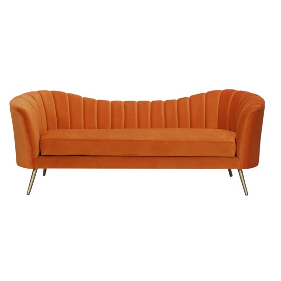 Stylish orange velvet sofa with beautifully curved channel tufted back and flared arms features gold-look brushed brass metal legs.