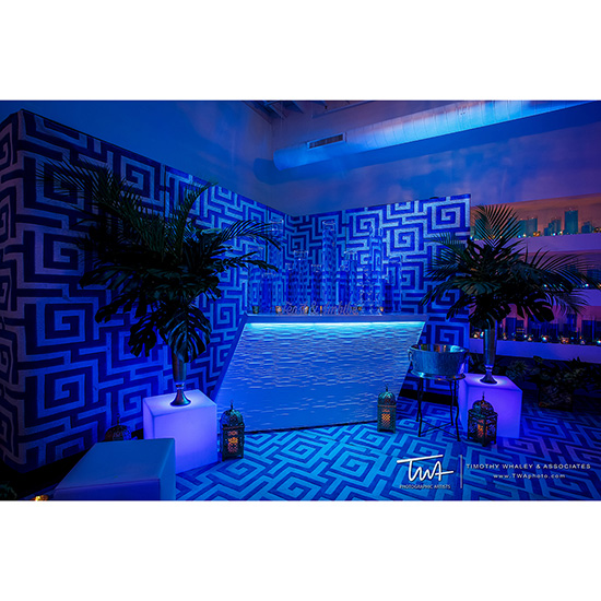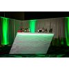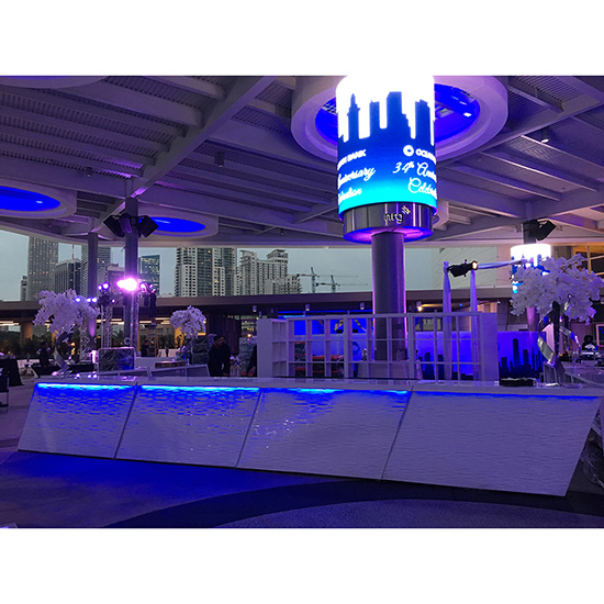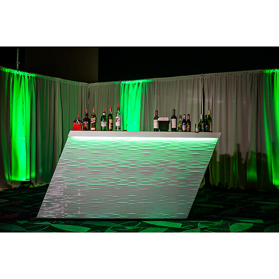 Sleek modern angled bar with clean white finish top includes speed rail and ice buckets behind. LED accent light under top casts down glow, with 13 selectable colors: Red, Orange, Amber, Yellow, Green, Aqua, Teal, Light Blue, Blue, Purple, Light Pink, Hot Pink, and White. Bar fronts adhere with large magnets. Available in Harlequin Silver or White Wave. Custom branding available.