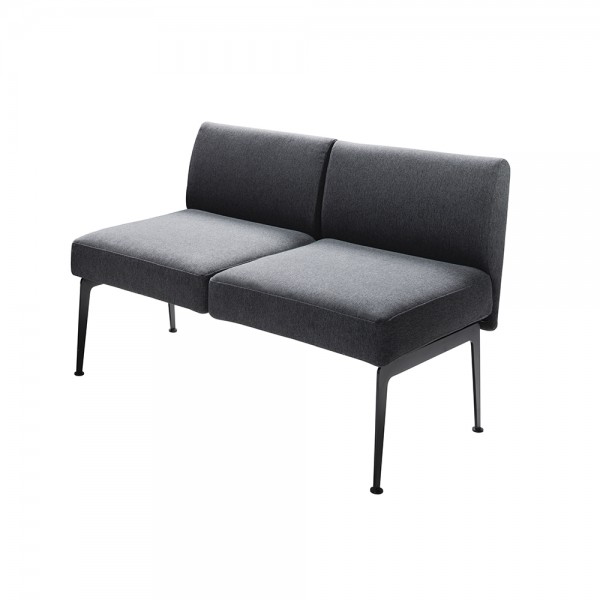 Modern European style modular armless loveseat with gray fabric and black metal base. Also Available with arms.