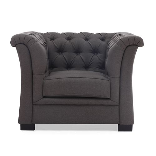 Features linen fabric and tufted design.