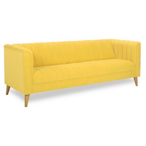 Contemporary tuxedo style sofa with luxurious yellow velvet fabric and channel effect on back and seat.
