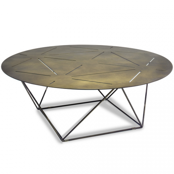 Cocktail table built from steel that is electroplated and burnished for a beautiful bronzed patina look. Modern top features laser cut perforated design.
