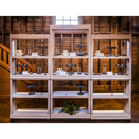Bar back grouping with gentle curved moldings and washed oak finish. Includes two 75″ bar backs and one 84″ bar back.