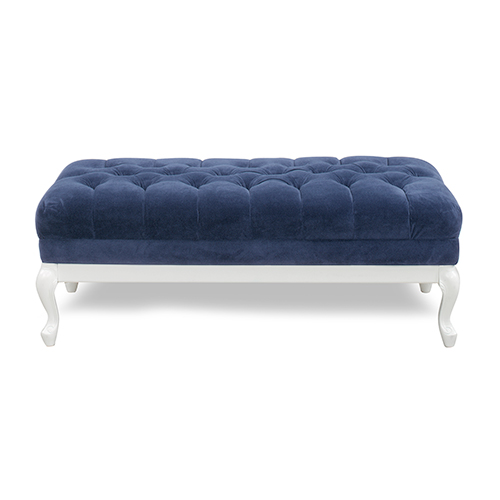 Royal blue microfiber fabric bench ottoman with white wood accents, tufted buttons, and cabriole legs. Features classic French look with a modern twist.