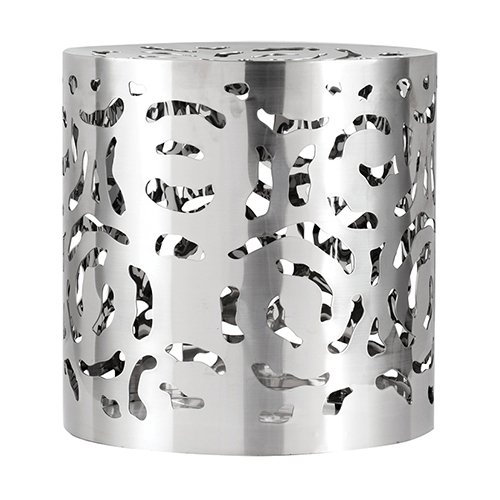 Laser cut metal table features geometric shapes and brushed metal finish. Add LED lights for glow effect.