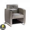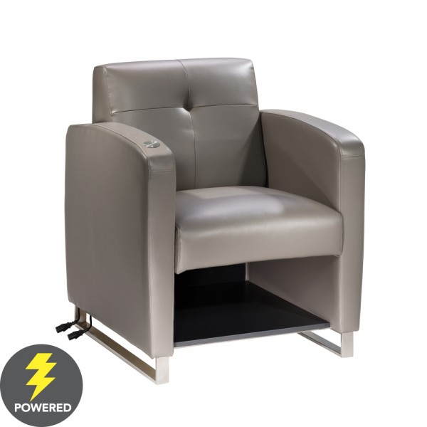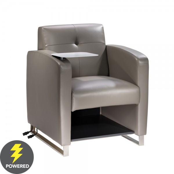 The soft dove gray vinyl chair with chrome base is perfect for education rooms or conferences. It features an in-arm charging panel with 3 USB ports and a convenient under the seat shelf. An additional A/C plug is provided at the base of the chair. Up to five chairs may be connected together. One 110V power source is required for each chair. Up to five chairs may be daisy chained together depending on client layout. 10A max per chair.