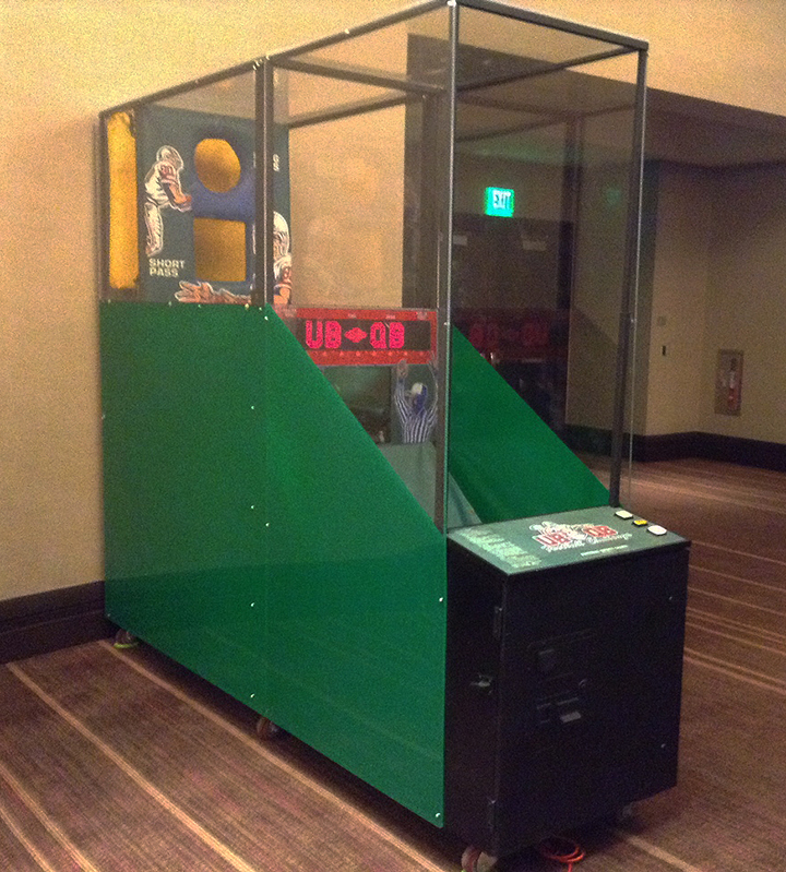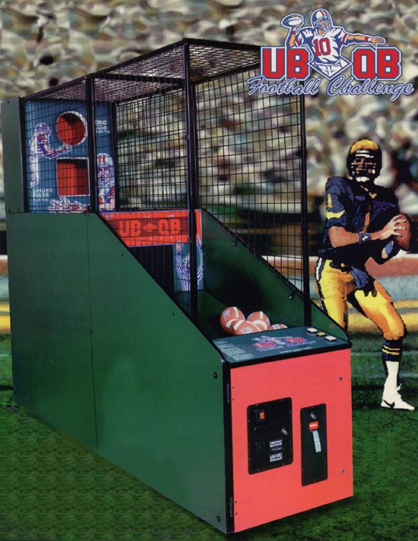 UB-QB II is a Football sports game, for one or two players. Players act as the QB, throwing footballs through holes for completions. The moving message sign keeps players & crowd informed of game status, score, and also entertains with graphical special effects.