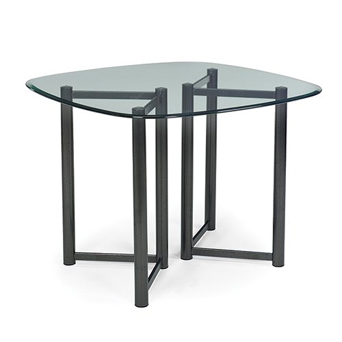 Square café table with glass top and black vein powder coated “V” shaped steel base. Available in Cocktail, Console/Sofa, End, Rectangular Café, and Square Café.